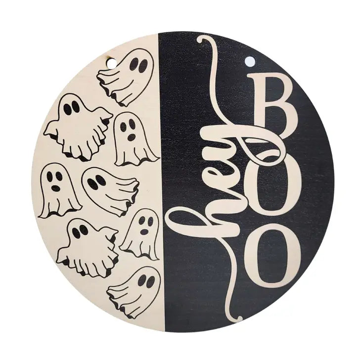 Hey Boo! What you do you think of our 12 inch Halloween circle sign? They make a perfect accent for any home display. All Signs are 1/4 inch thick and stained on the the back of the sign. We use a rustic jute string for hanging.