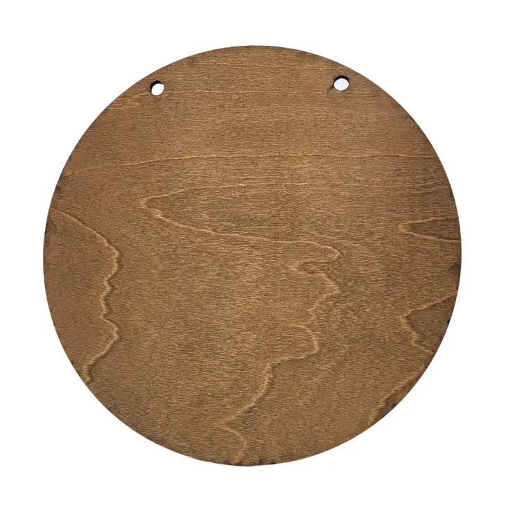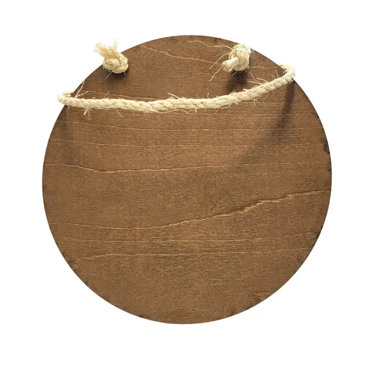 Greet your guests this holiday season with one of our 12 inch circle signs! They make a perfect accent for any home display. All Signs are 1/4 inch thick and stained on the the back of the sign. We use a rustic jute string for hanging.